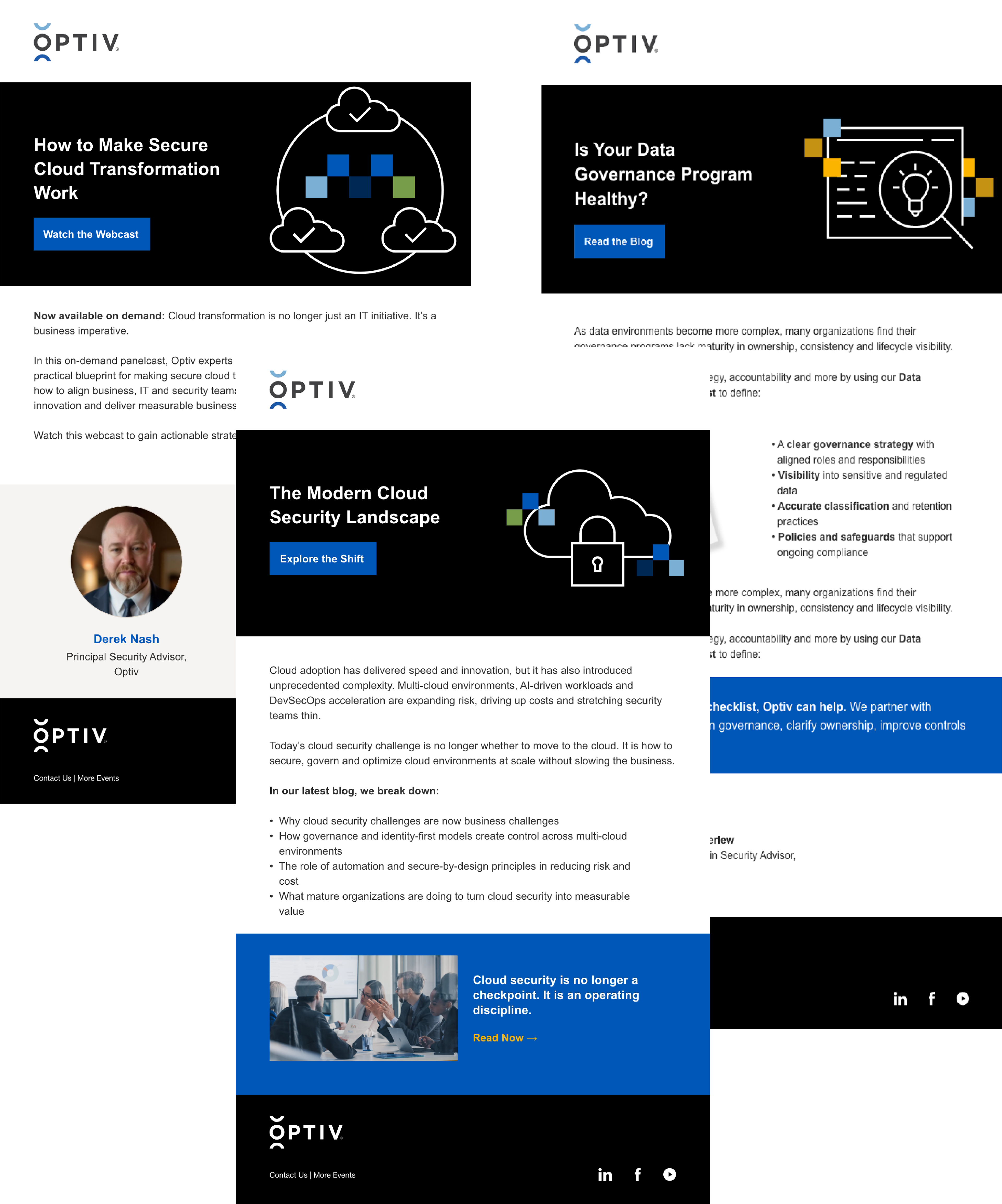 In Q1 2026, the Creative and Marketing teams successfully launched four national campaigns, delivering a coordinated go‑to‑market effort that aligned strategy, messaging, and design across channels. The work reinforced Optiv’s core solutions while driving early momentum, engagement, and pipeline impact.